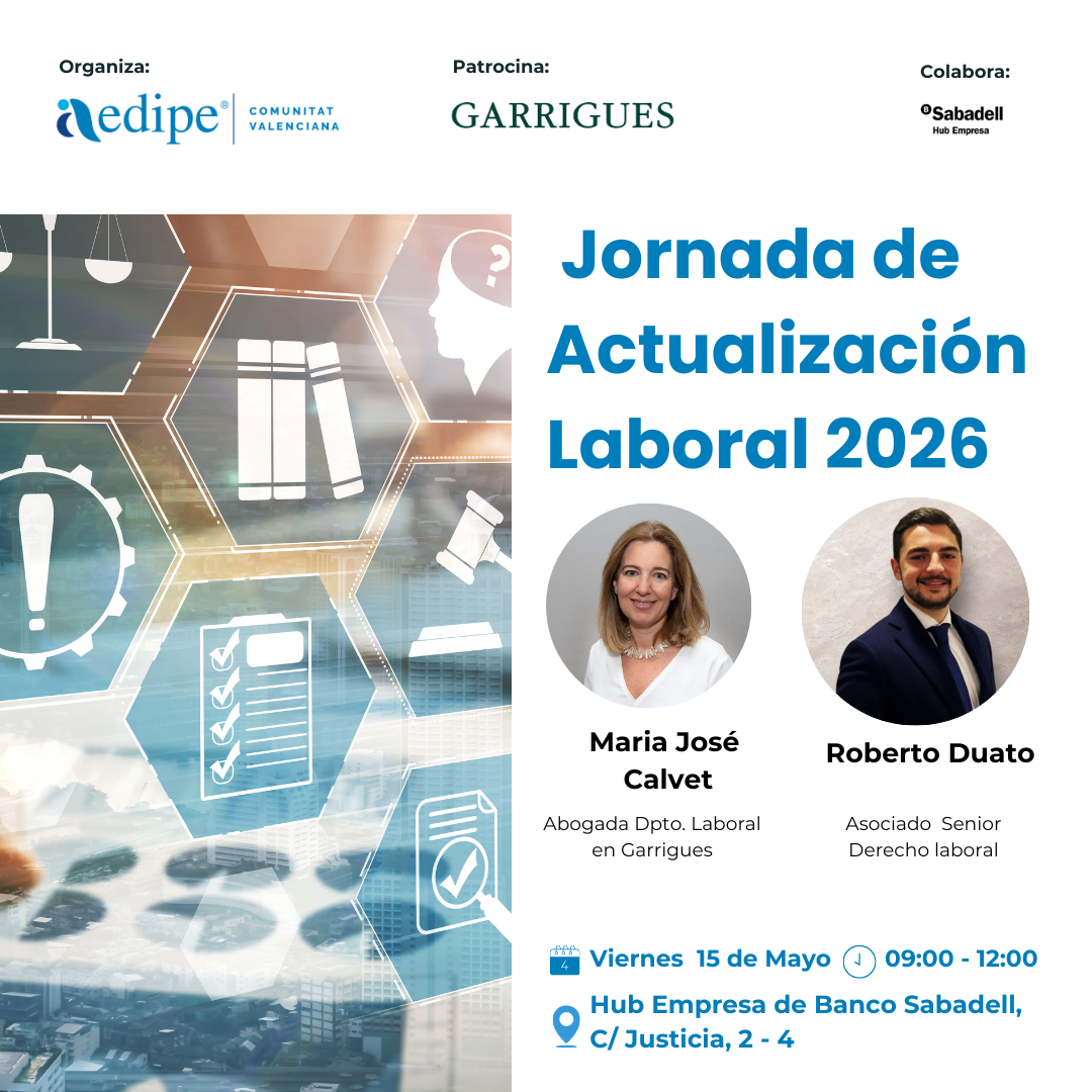 En esta jornada conoceremos de la mano de María José Calvet y Roberto Duato, del despacho de abogados GARRIGUES, las últimas noticias, modificaciones y mejoras en cuanto a derecho laboral se refiere.