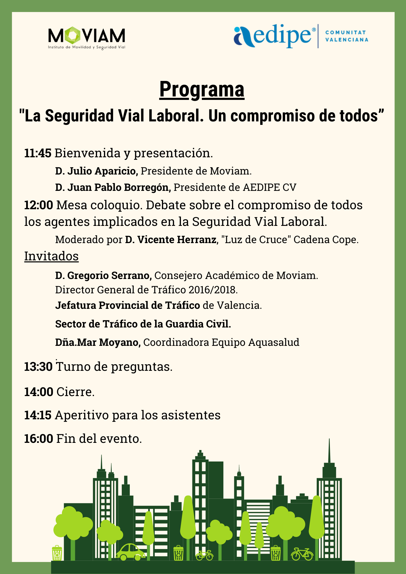 AEDIPE CV en colaboración con MOVIAM organiza una Mesa Coloquio moderada por Vicente Herranz, Director de «Luz de Cruce» en la Cadena COPE, en la que debatiremos sobre la Movilidad Sostenible y Segura desde los puntos de vista de todos los agentes que intervienen en ella, y abordaremos cuestiones como la obligatoriedad de la elaboración de los Planes de Movilidad Sostenible y Segura, y la obtención del Sello de calidad de la DGT en las empresas. Para ello contaremos con la participación de altos cargos de la Jefatura de Tráfico de Valencia y de la Agrupación de Tráfico de la Guardia Civil.